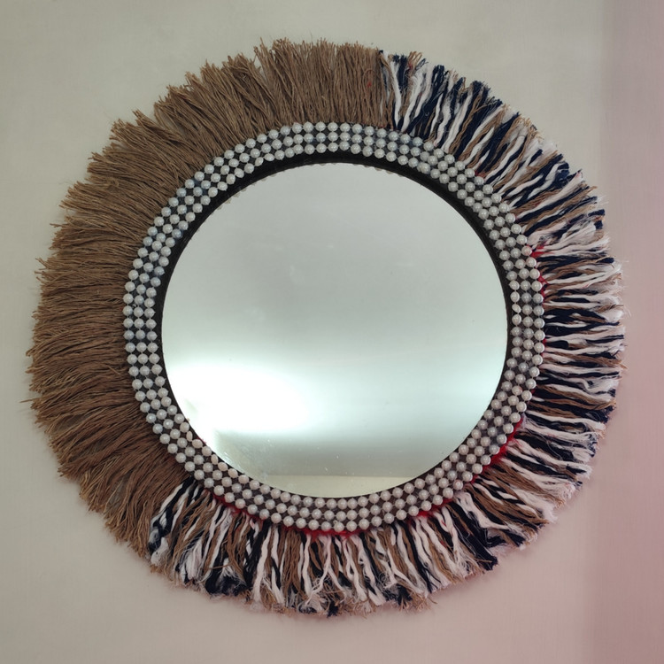این آینه از نوع گرد با قاب چوبی کنفی تیره روشن با مروارید های لپه ای سفید می باشد