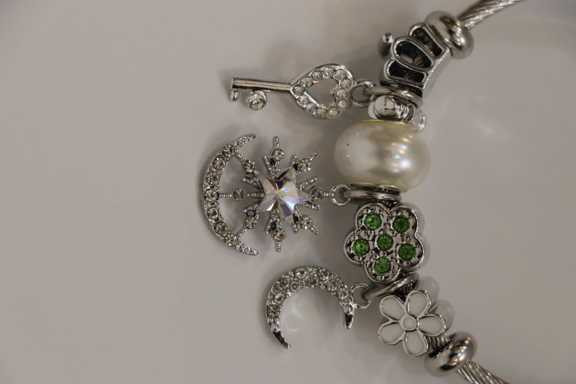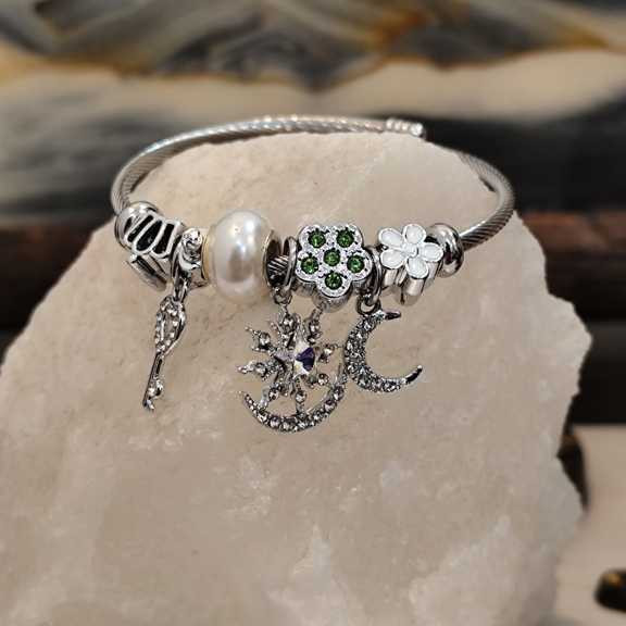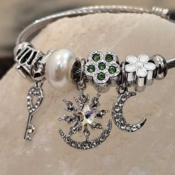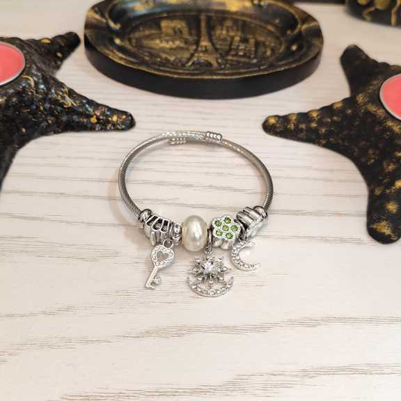 دستبند زنانه النگویی پاندورا طرح گل نگین دار سبز با ماه و ستاره