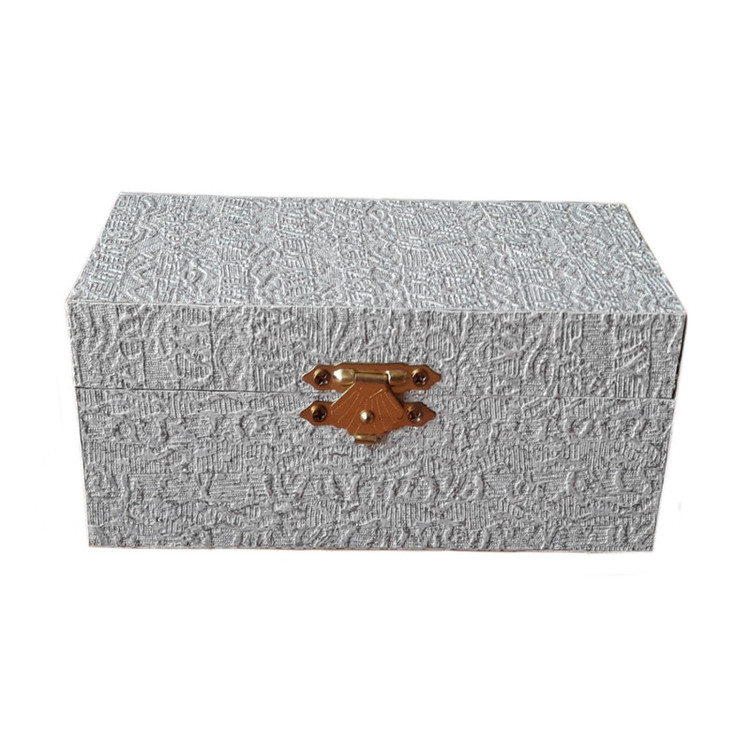 جعبه جواهرات دربدار دارای قفلی نعلی چفت شونده با روکش رنگ ثابت بوده که در عین حال که محکم و مقاوم هست بسیار سبک می باشد. کفی این جعبه از فوم فشرده تشکیل شده است و روکشی از جیر قرمز بر روی آن می باشد . شیارهایی بر روی فوم در کف جعبه وجود دارد که جواهرات را از برخورد باهم و خورندگی حفظ میکند. طول جعبه 13/5 سانتی متر و عرض و ارتفاع آن 7 سانتی متر می باشد. جعبه دست ساز بوده و از چسب چوب بی رنگ جهت استحکام آن استفاده شده است.