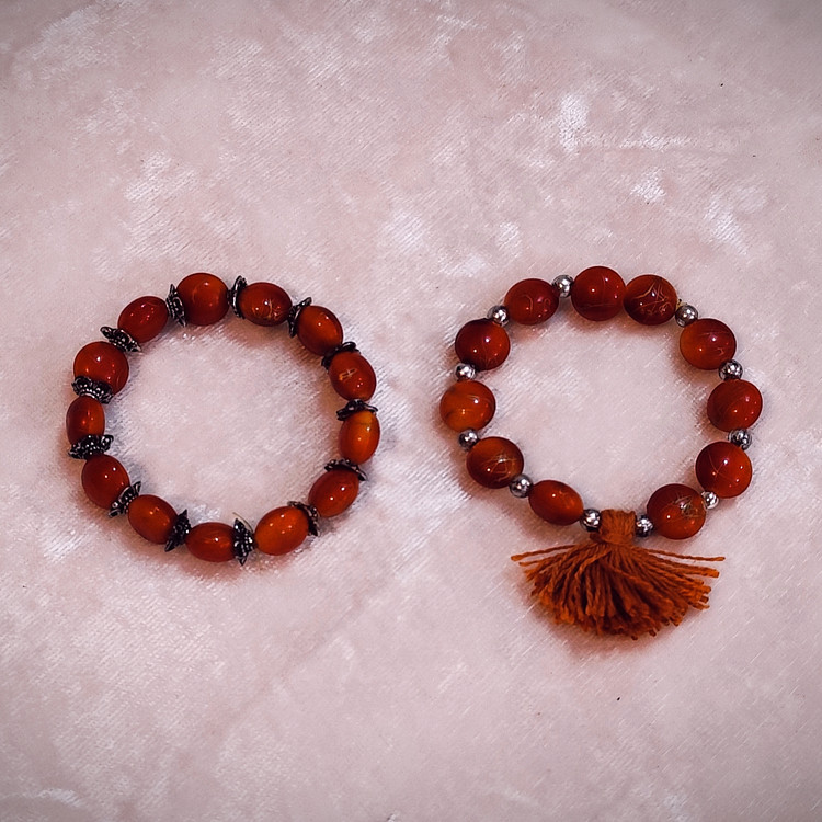 دستبند دو عددی زنانه سنگی کشی با آویز نخی رنگ شرابی مدرن کد 8845